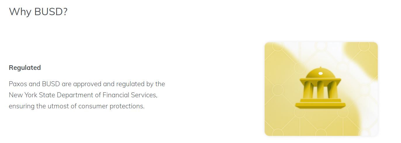 SponsoredСтейблкоин — это токен, курс которого привязан к курсу другого актива. В случае с Binance USD, речь идет о долларе США. На сайте Paxos говорится о том, что компания, как и сама криптовалюта BUSD, одобрены и урегулированы Департаментом финансовых услуг штата Нью-Йорк.