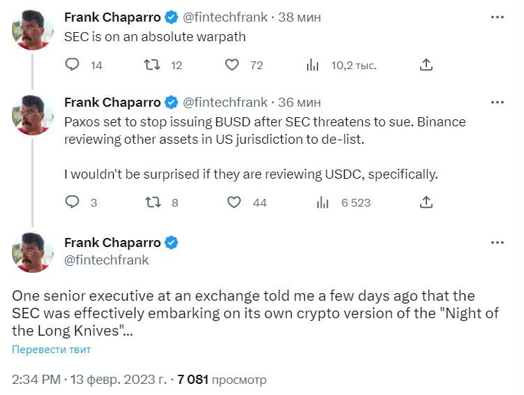 Репортер The Block Фрэнк Чапарро поделился с подписчиками инсайдом, согласно которому SEC решила устроить в криптоиндустрии тотальную зачистку. Также он рассказал о том, что на фоне происходящего Binance проводит ревизию других активов, которые есть в листинге криптобиржи. По его мнению, участникам криптосообщества не стоит удивляться, если с торговой платформы пропадет один из главных конкурентов BUSD — USD Coin (USDC).
