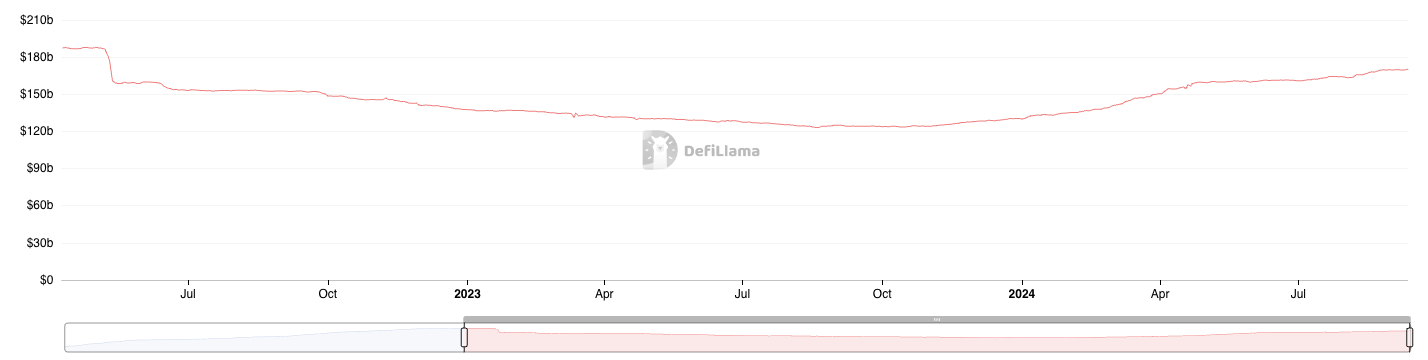 По данным DefiLlama, с минимума на уровне $119,1 млрд в ноябре 2023 года рыночная стоимость стейблкоинов к настоящему моменту выросла более чем на 42%.
