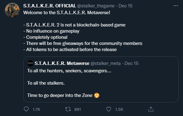 SponsoredОтказ от NFT произошел спустя пару часов после того, как в компании анонсировали метавселенную по мотивам видеоигры. Что именно будет представлять из себя так называемая S.T.A.L.K.E.R. Metaverse, остается непонятно.