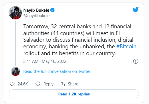 Президент Найиб Букеле объявил в Twitter, что конференция будет посвящена «расширению доступа к финансовым услугам, цифровой экономике, банковскому обслуживанию, внедрению биткоина и преимуществам криптовалюты в нашей стране». На конференции будут представители государств Латинской Америки, Африки и Азии.