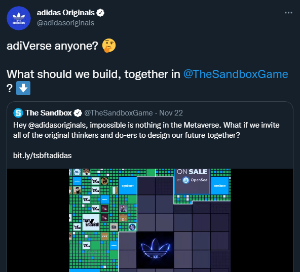 SponsoredРыночная капитализация альткоина взлетела до $7,3 млрд. Активность вокруг SAND разворачивается по мере появления новостей о сотрудничестве Sandbox c Adidas. В двадцатых числах ноября, официальный твиттер-аккаунт Adidas намекнул на появление метавселенной adiVerse на базе блокчейна Sandbox.
