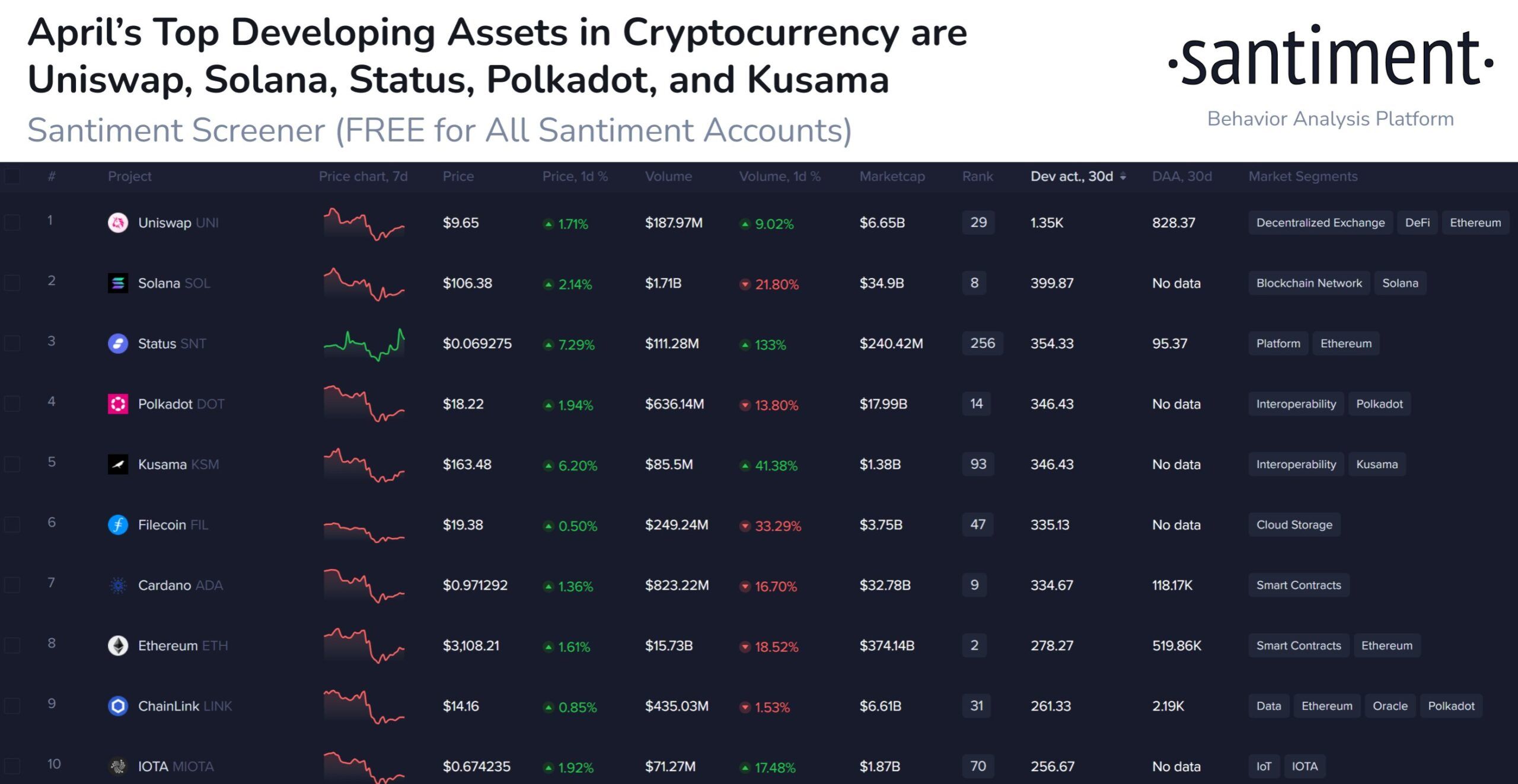 Uniswap, Solana и Status вошли в топ-10«наиболее быстрых по разработке» альткоинов. Об этом Твиттере сообщили аналитики площадки Santiment.