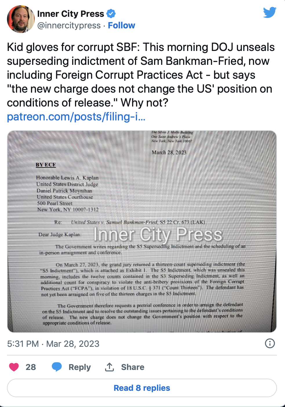 Прокуроры, выдвинувшие новые обвинения в адрес SBF, подверглись критике со стороны общественной организации Inner City Press за то, что так и не пересмотрели условия его освобождения под залог.