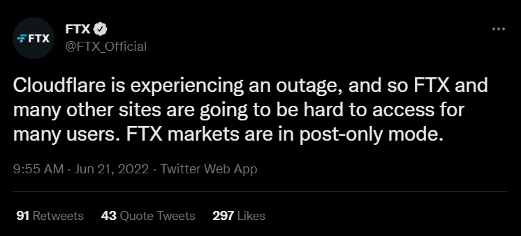 Поставщик облачных услуг по защите от DDoS-атак Cloudflare столкнулся с неполадками по всему миру, чем вызвал сбои у крупных криптобирж