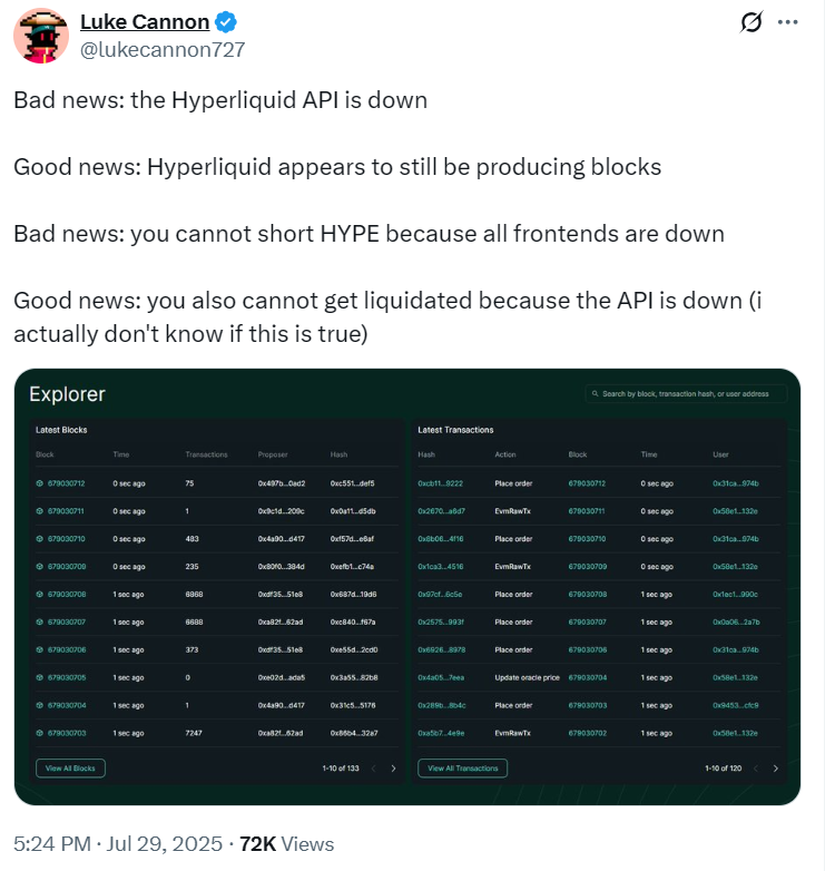 Тем не менее Hyperliquid продолжала создавать блоки во время сбоя, и, похоже, бэкэнд не пострадал. Неполадка длилась всего несколько минут и не нанесла серьезного ущерба.