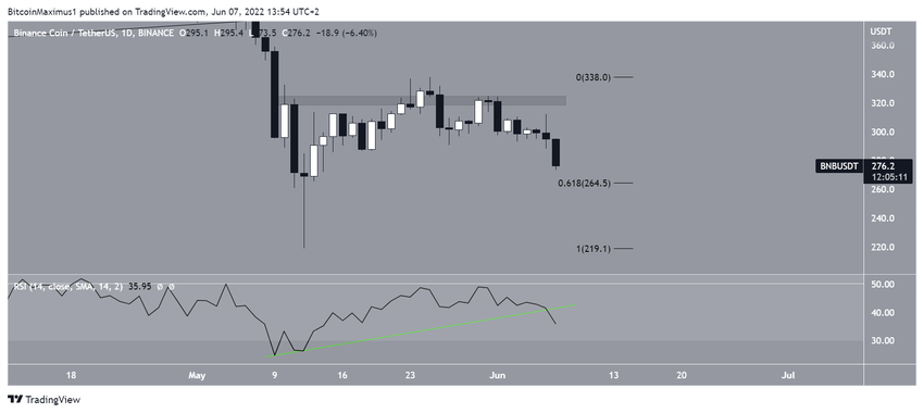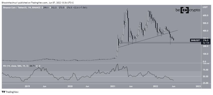 Курс BNB достиг 10 мая 2021 года исторического максимума на $691 и с тех пор снижался. В ноябре 2021 года цена сформировала чуть понижающийся максимум и после этого ускорила темпы снижения.