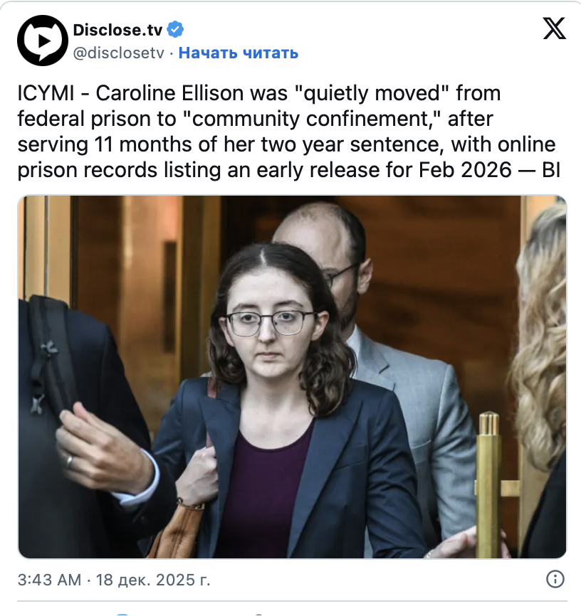 По состоянию на декабрь 2025 года Кэролайн Эллисон переведена под домашний арест. Ее окончательное освобождение ожидается в начале 2026 года.