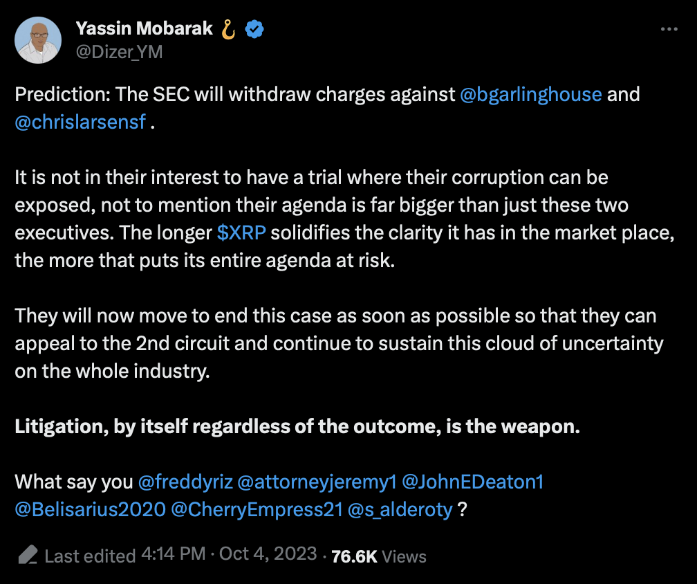 Мобарак заявил, что SEC не заинтересована в «судебном разбирательстве, в ходе которого может быть разоблачена их коррупция». Он также отметил, что планы регулятора куда более масштабны, поэтому Комиссия будет стремиться как можно скорее завершить дело, подать апелляцию и поддержать тем самым неопределенность в индустрии.