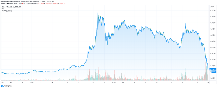 В результате XRP за сутки подешевел на 36% и протестировал минимум в области $ 0.21. На момент написания статьи монета торгуется на уровне $0.36. Последние максимумы были зафиксированы в районе $0.79.