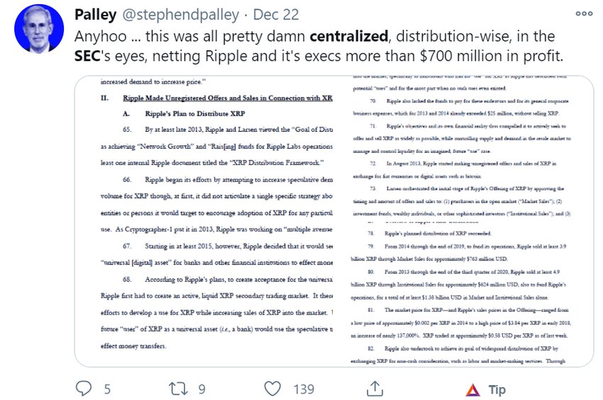 Поскольку Ripple продавала токены, не соблюдая официальный порядок регистрации, установленный для ценных бумаг, это означало, XRP находятся в обращении незаконно. На следующий день SEC действительно предъявила Ripple официальное обвинение в получении $1,3 млрд незаконным путем.