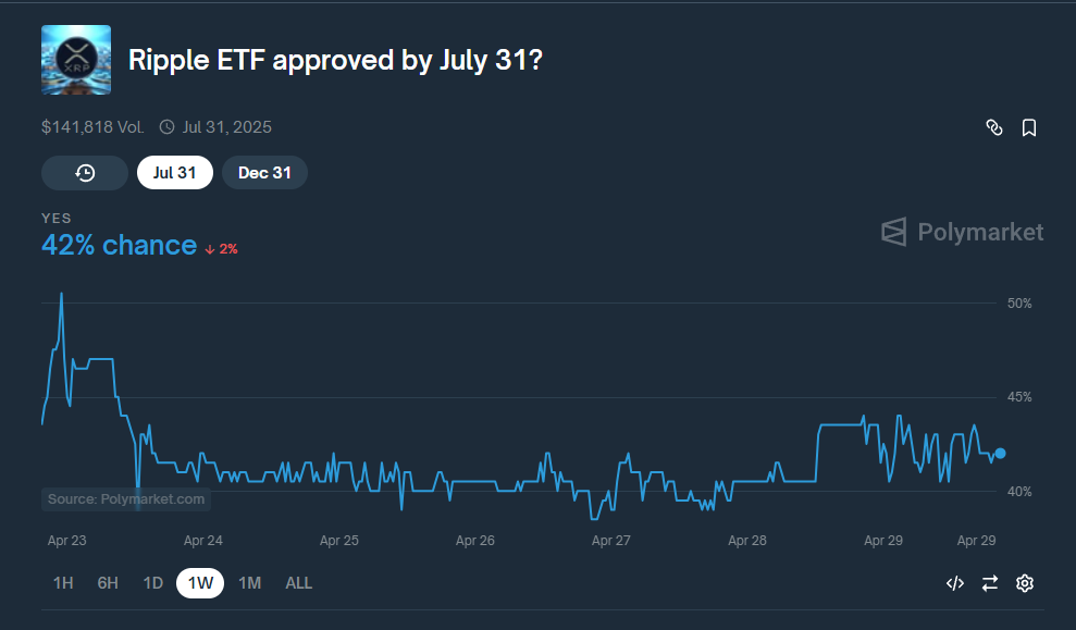 На платформе рынков предсказаний Polymarket вероятность того, что SEC одобрит XRP-ETF до 31 июля, резко снизилась. За сутки показатель снизился на 8%. На такой исход теперь ставят только 45% пользователей.