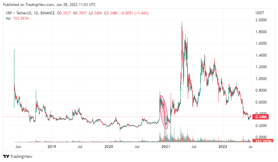 В 2021 году XRP оказался одним из немногих токенов – лидеров капитализации, которым так и не удалось обновить абсолютный максимум на фоне бычьего движения крипторынка. Пик стоимости монеты, по данным ресурса CoinMarketCap, зафиксирован 4 января 2018 года на высоте $3.84. По состоянию на момент написания обзора, XRP торгуется на 90.94% ниже максимума.