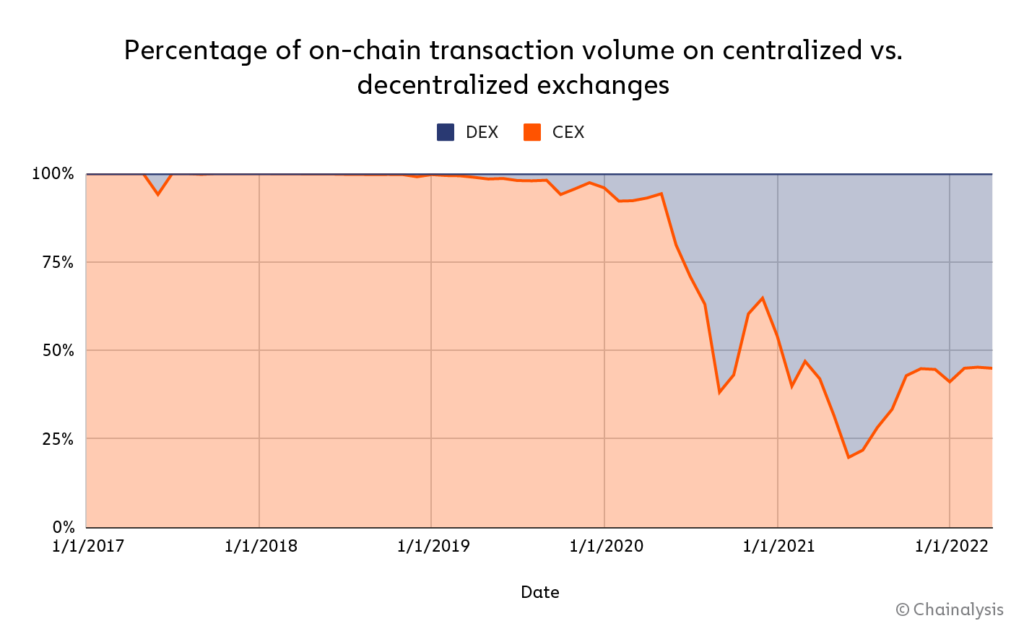 Централизованные (CEX) и децентрализованные (DEX) биржи почти поровну разделили долю ончейн-транзакций. Об этом у себя в блоге сообщили аналитики Chainalysis. В компании утверждают, что на текущий момент на DEX приходится около 55% от всех ончейн-транзакций, связанных с торгами. У CEX этот показатель ниже и составляет 45%.
