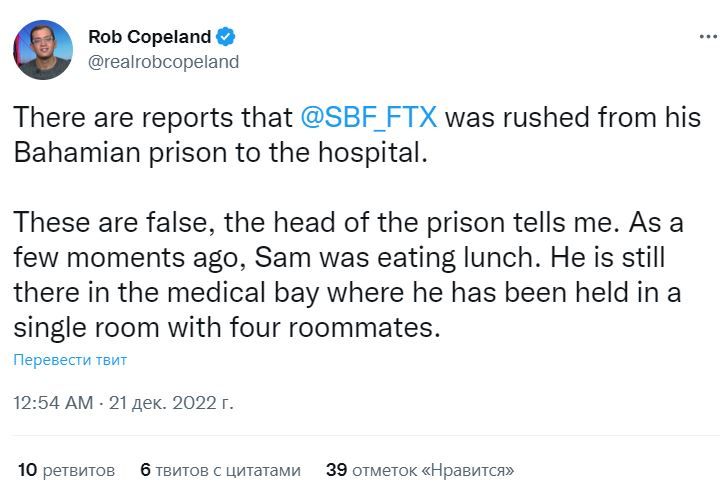 «Появились сообщения о том, что Сэм Бэнкман-Фрид попал из тюрьмы в больницу. Глава исправительного учреждения сказал мне, что это не правда. Еще несколько мгновений назад Сэм ел свой ланч. Он все еще находится в медицинском крыле, где его держат в комнате с четырьмя соседями», — написал репортер в своем микроблоге