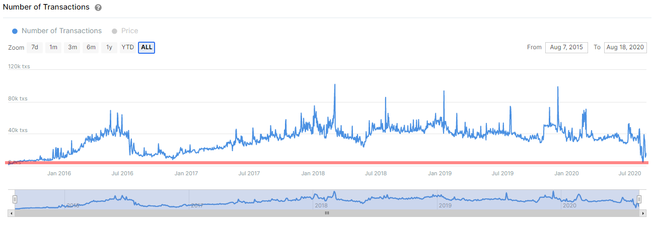 Согласно данным блокчейна, почти сразу после атак 51%, которые произошли в начале августа, количество операций в сети Ethereum Classic обрушилось до уровня конца 2015 года.