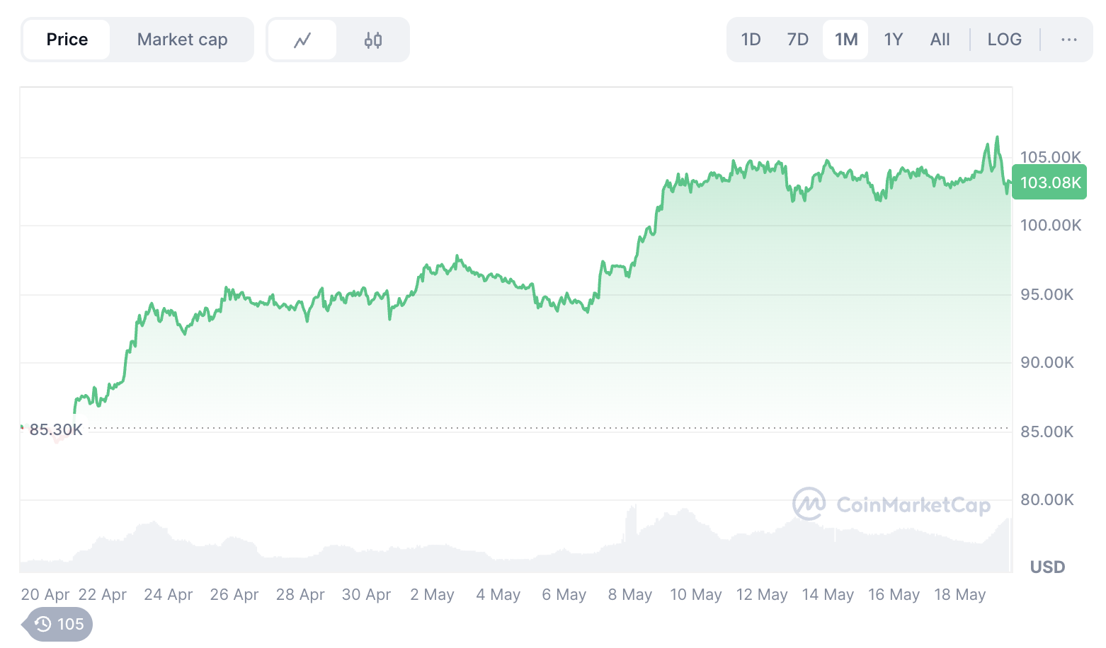 По данным CoinMarketCap, на момент написания этого материала BTC торгуется на уровне $103 000. Текущая отметка на 5% ниже исторического максимума (ATH) на $109 тыс. Его биткоин обновил в январе этого года.