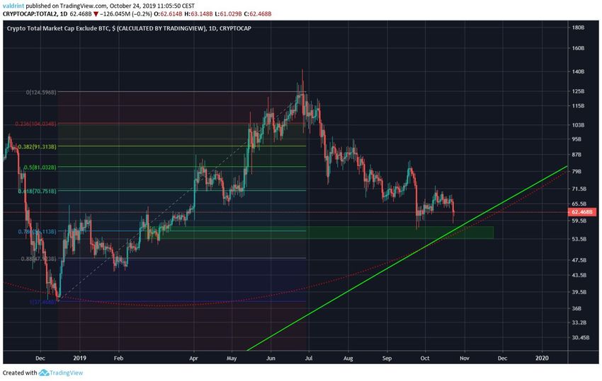 Согласно результатам нашего анализа с опорой на несколько сходящихся важных уровней поддержки, мы предположили, что рынок может уже очень скоро достичь минимума. Криптовалютный трейдер @davthewave также пишет в своем аккаунте в Twitter о том, что показатель капитализации рынка альткоинов (ALTCAP) приближается к зоне покупки. По его мнению, это может считаться указанием на скорое начало сезона альткоинов.