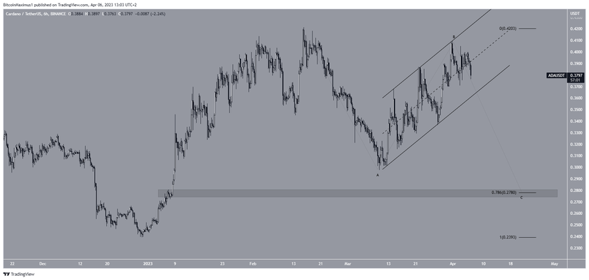 Более короткий 6-часовой график дает основания предположить, что ADA с 10 марта растет внутри восходящего параллельного канала. Такие каналы обычно ассоциируются с коррекционными структурами, а довольно высокая волатильность цены предполагает, что мы имеем дело с медвежьей структурой.