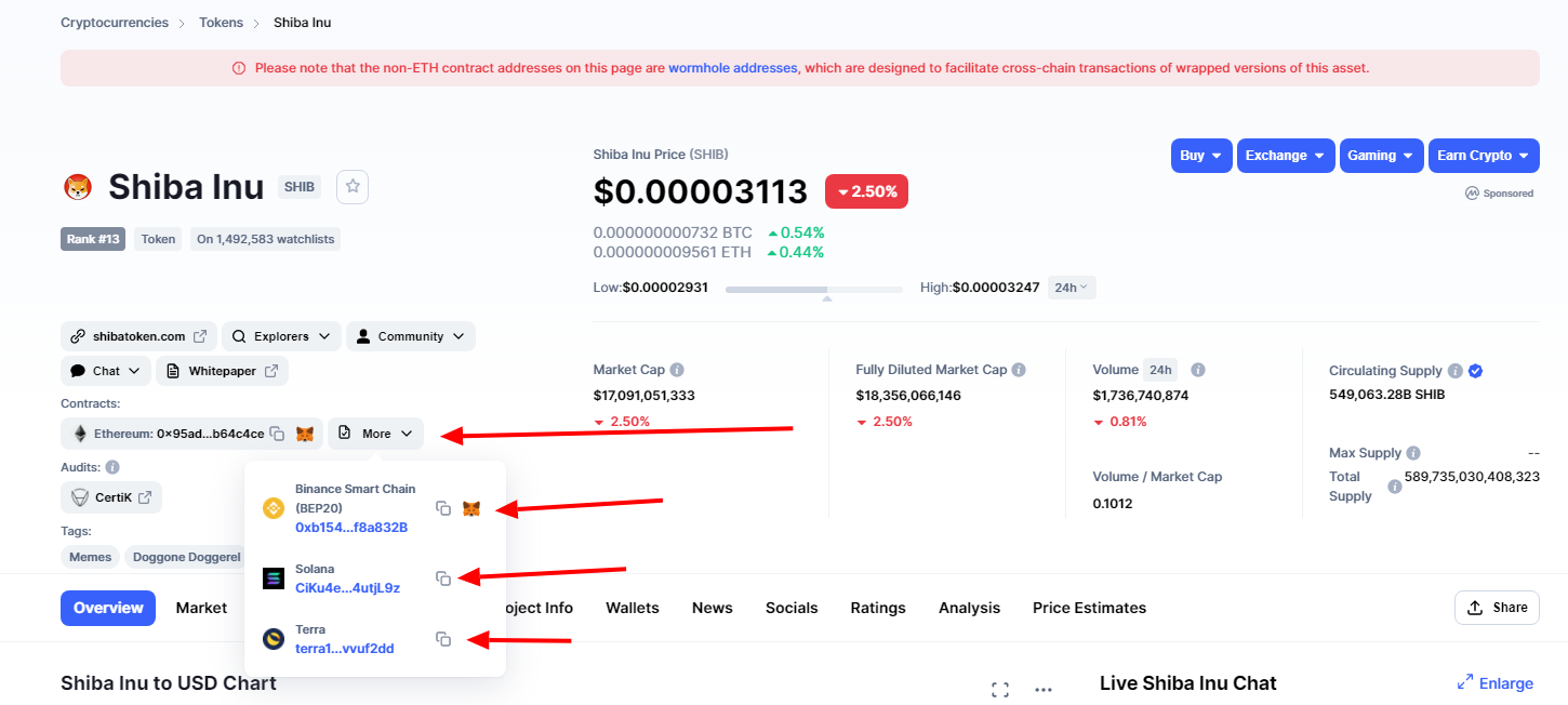 SponsoredПретензия разработчиков касается появления фейковых смарт-контрактов для SHIB в списке официальных на странице проекта. Фактически SHIB является исключительно токеном на базе блокчейна Ethereum, однако на странице в CMC числятся и другие сети, включая Solana и Binance Smart Chain. Редакция подтвердила подлинность включения сторонних адресов на странице SHIB в CMC.