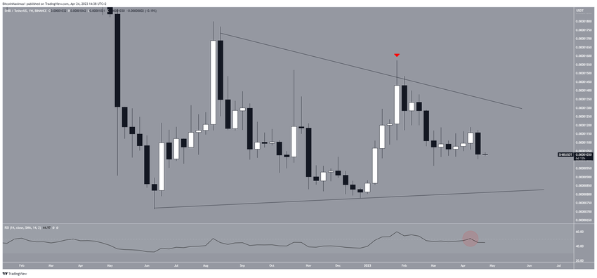 На дневном графике курс SHIB с июня 2022 года торгуется внутри симметричного треугольника. Этот паттерн считается нейтральным, поэтому цена с одинаковой долей вероятности может совершить из него как бычий, так и медвежий прорыв. Сейчас монета торгуется в средней части треугольника и при этом находится в нисходящем тренде с момента отскока от линии сопротивления 4 февраля (выделено красным).