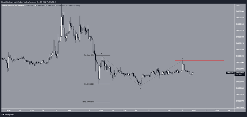 Анализ более короткого 6-часового таймфрейма также показывает, что прогноз по SHIB является медвежьим. Здесь можно увидеть, что цена завершила формирование восходящей коррекционной структуры W-X-Y, в которой соотношение волн A:C составило почти 1:1.