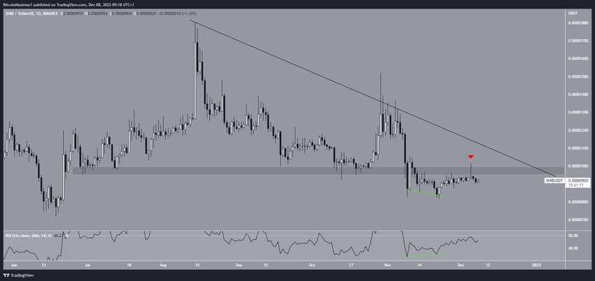 Как показывают результаты технического анализа графика SHIB, с 15 августа токен снижался вдоль линии долгосрочного нисходящего сопротивления. Цена множество раз отскакивала от этой линии (красный круг) в период с 29 октября по 4 ноября. После этого она ненадолго пронзила область поддержки $0.0000097 и 22 ноября достигла минимума на $0.0000081.