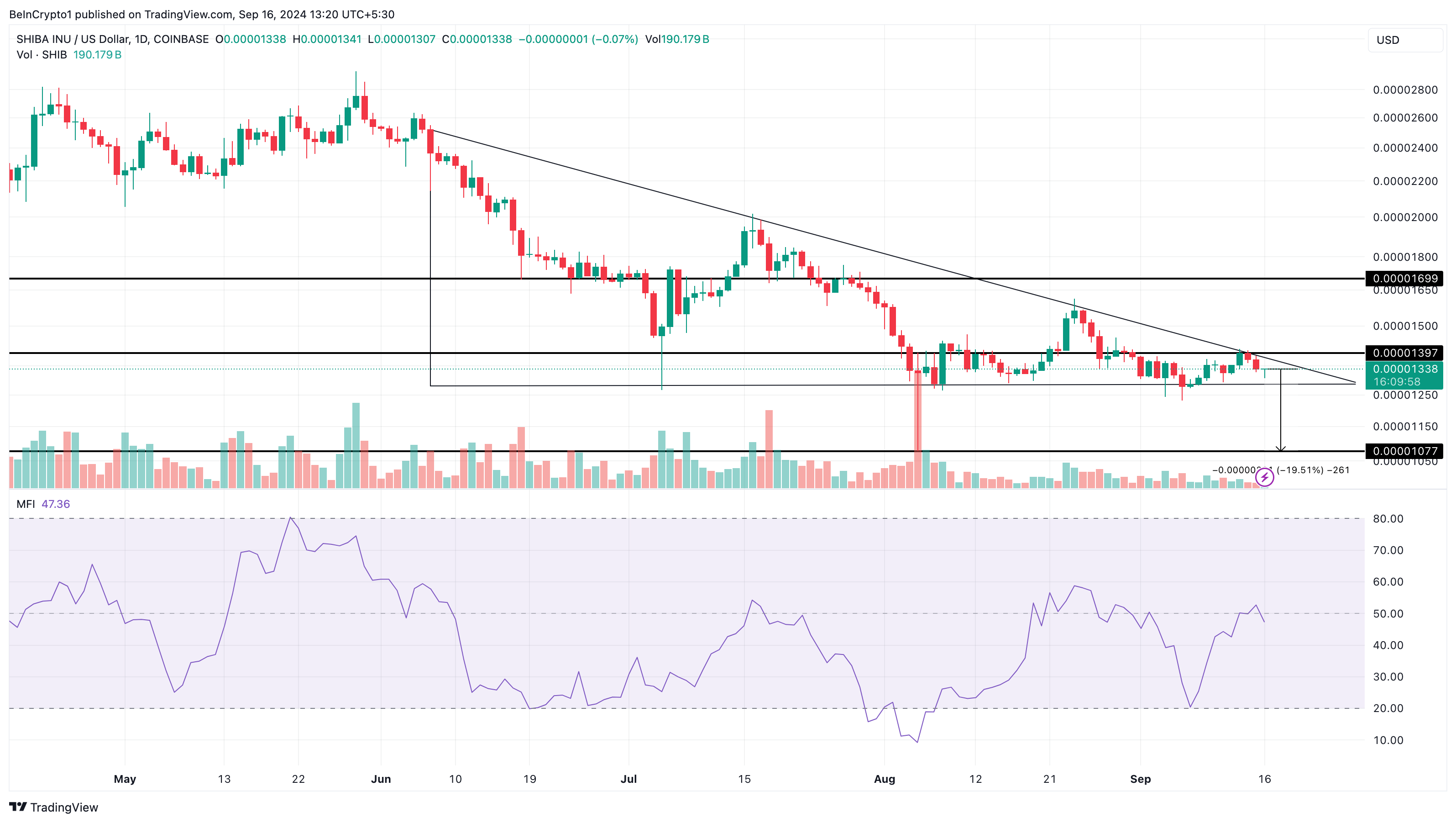 Еще с июня Shiba Inu движется в рамках паттерна «нисходящий треугольник». Этот паттерн, образованный нисходящей верхней линией тренда и горизонтальной поддержкой, обычно указывает на то, что продавцы контролируют ситуацию, и цена, скорее всего, будет снижаться.