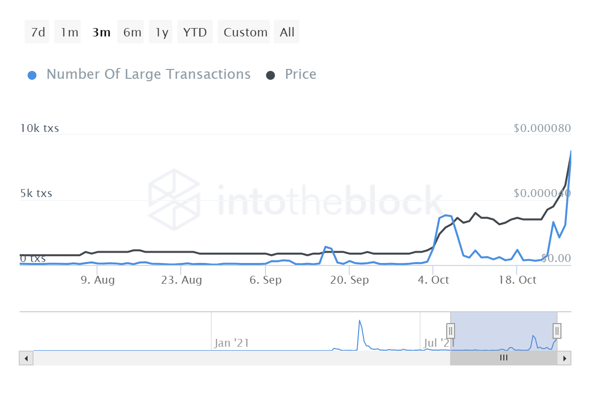На фоне всеобщего хайпа выросли сделки среди крупных инвесторов. Например, за последние двое суток было совершено свыше 9000 транзакций на сумму более $100 000. Это, как полагают в IntoTheBlock, дает больше информации о том, кто мог быть настоящим инициатором ралли.