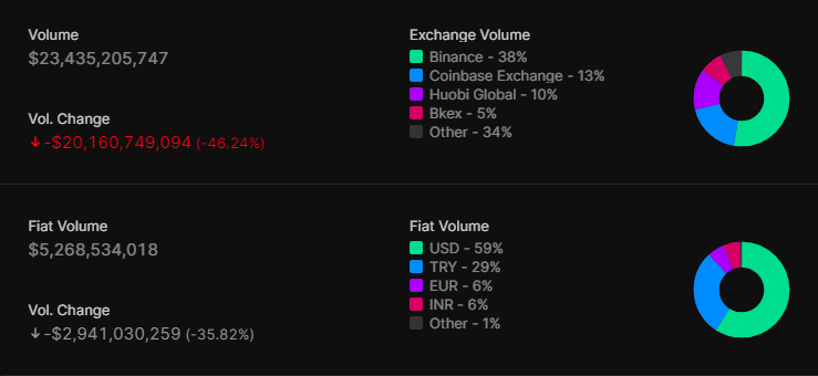 На момент написания материала SHIB торгуется в плюсе на 8% у отметки в $0,00007119. Тем не менее, суточные объемы торгов обвалились почти на 50% до $23 млрд. Наибольший объем торгов альткоином зафиксирован у Binance (37%). На втором месте расположилась Coinbase (13%), а на третьем — Huobi (10%). Согласно данным Nomics, на торги в паре SHIB/USD приходится ~60% от объема. Более того, почти 30% фиатных торгов зафиксировано в паре с турецкой лирой.