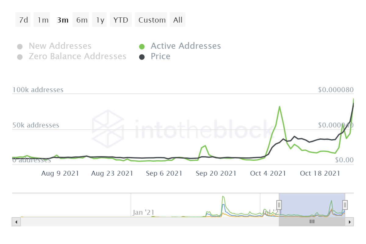 В то же время примечательно то, что число активных адресов даже на пике цены SHIB не достигло и 100 000 единиц. Для сравнения, число подписчиков проекта в Twitter составляет более 1,5 млн. Также аналитики отметили, что около 5000 адресов успели скупить 20% SHIB по рекордно низкому курсу.