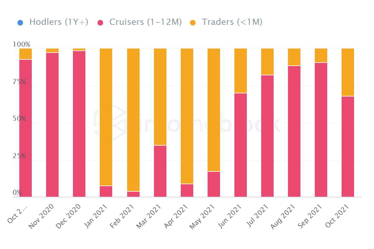Вопреки впечатляющему росту капитализации, альткоин shiba inu (SHIB) не имеет поддержки среди ходлеров. К такому выводу пришли аналитики IntoTheBlock в своем последнем отчете. Согласно опубликованным данным, большинство владельцев SHIB — это либо спекулянты (держащие SHIB от 1 до 12 месяцев), либо трейдеры (менее 1 месяца).