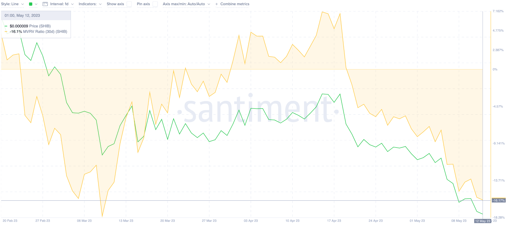 Несмотря на 8%-ный рост цены мемкоина, большинство инвесторов не хотят продавать SHIB прямо сейчас. Показания индикатора MVRV, который рассчитывает соотношение рыночной стоимости актива к реализованной, сообщают, что на купившие токен за последние 30 дней пользователи несут убытки в размере 16%.
