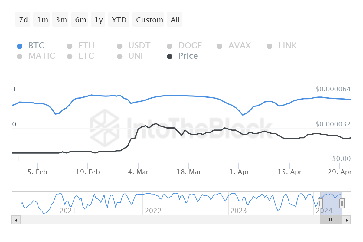 Корреляция актива с биткоином также угрожает ралли. Показатель для SHIB составляет 0,81: это означает, что в случае падения BTC потянет мемкоин за собой.