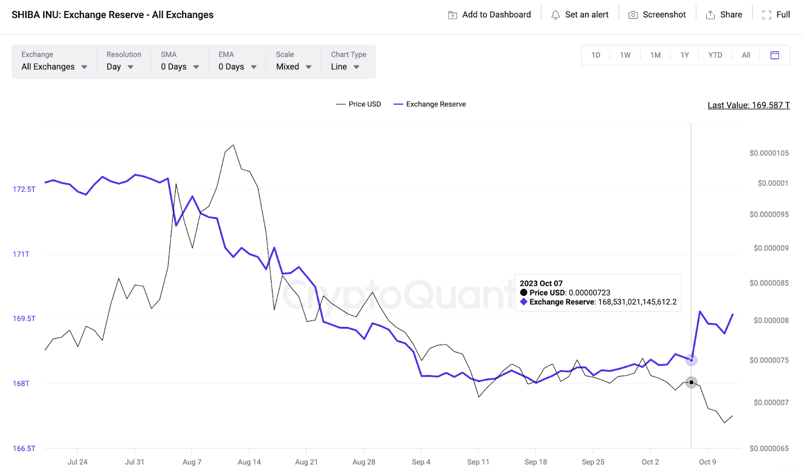 На графике CryptoQuant показано, что в период с 7 октября по 2 ноября держатели мемкоина перевели на криптобиржи 2 трлн SHIB. На данный момент общий объем предложения Shiba Inu на централизованных платформах превысил отметку в 170 трлн.
