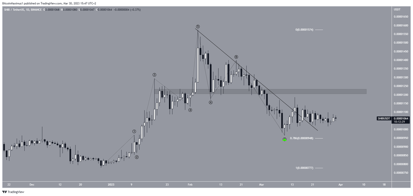 Между тем волновой анализ тоже сулит токену укрепление. Начиная с января SHIB завершил формирование пятиволновой бычьей структуры, а затем коррекцию A-B-C, которая закончилась в районе уровня поддержки Фибо 0,786 коррекции.
