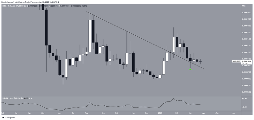 Результаты технического анализа недельного графика показывают, что курс коина SHIB не может определиться с направлением. Цена прорвала линию нисходящего сопротивления и превратила ее в поддержку (зеленый значок), но не смогла закрепить этот рост.