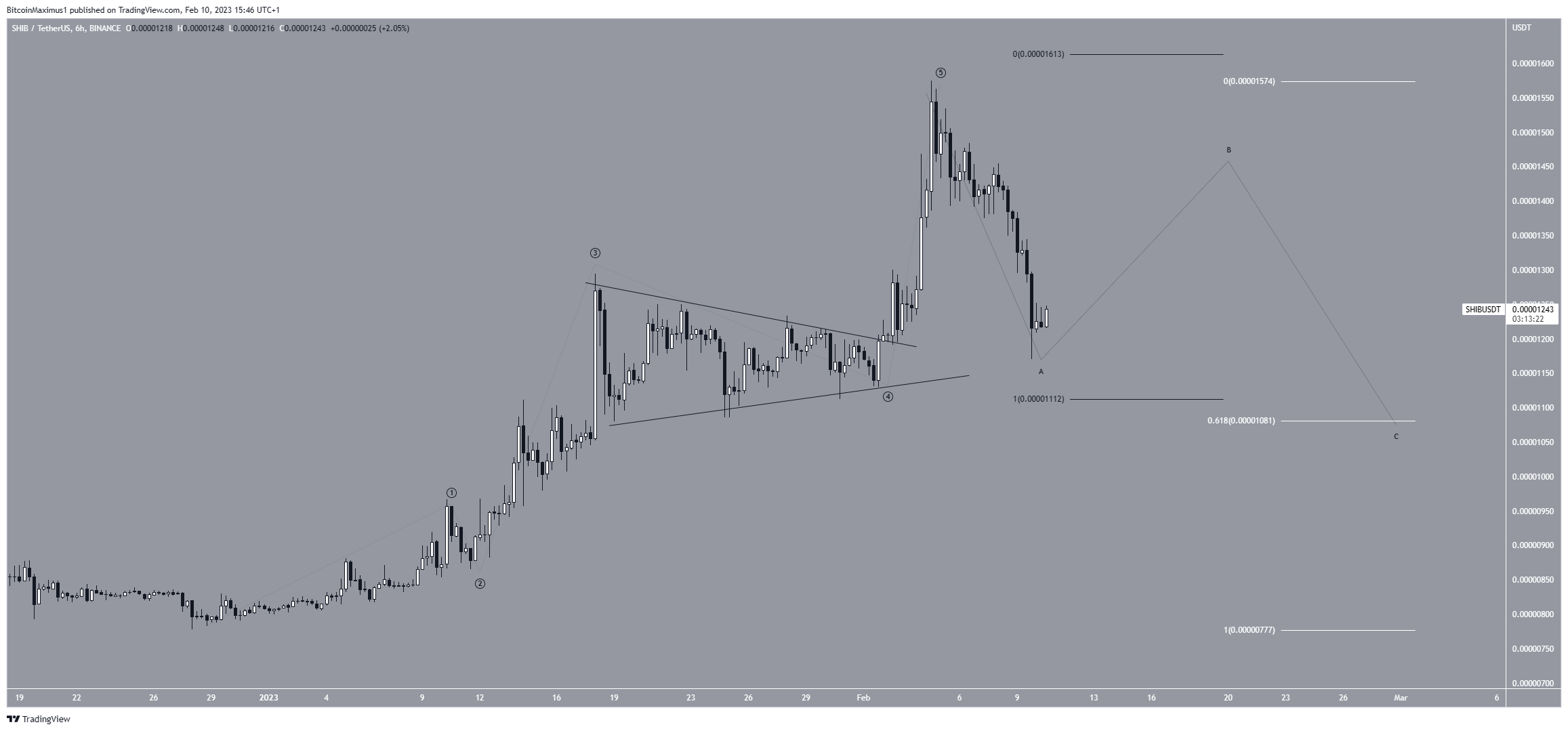 Технический анализ на шестичасовом таймфрейме показывает, что SHIB завершил пятиволновое восходящее движение, которое привело к максимуму $0,0000157. Его определяющей чертой считается треугольник, который был частью четвертой волны. Более того, пятая волна удлинилась и имела длину первой и третьей волн вместе взятых.