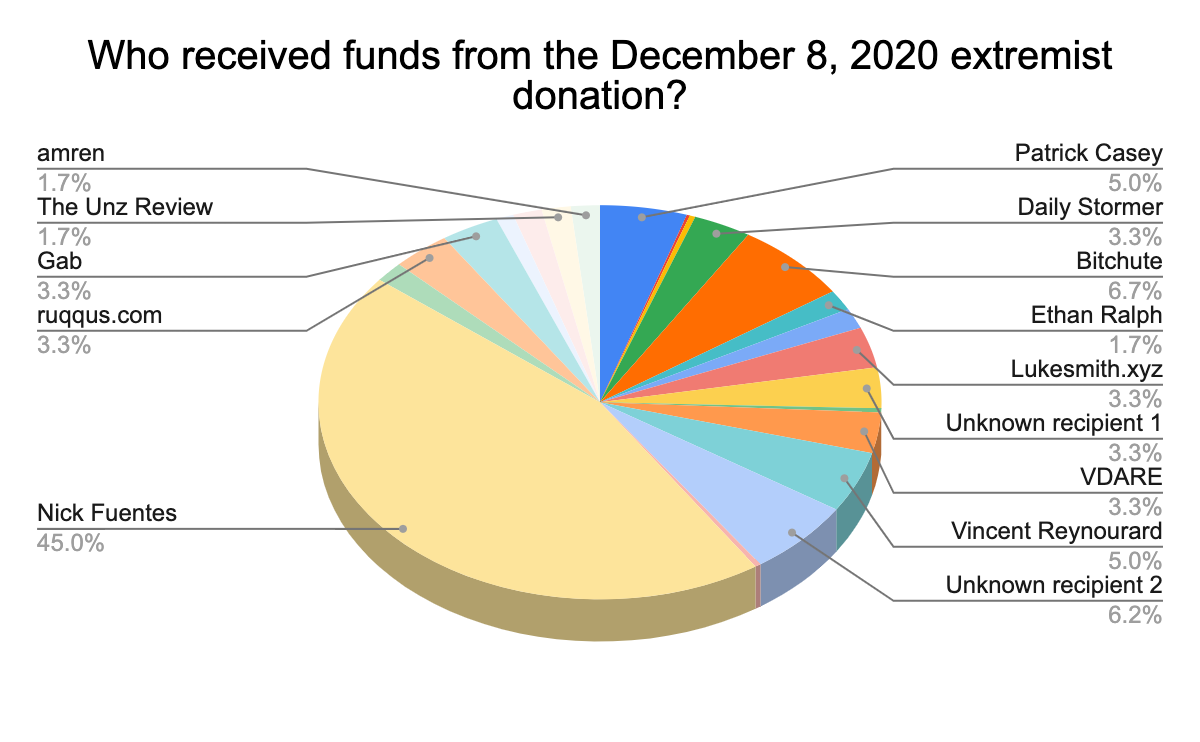 Как утверждают в Chainalysis, крупные суммы в биткоине также получили антииммиграционная организация VDARE, стример альт-правых (интернет-движение) Итан Ральф и несколько других адресов, владельцы которых пока не установлены.