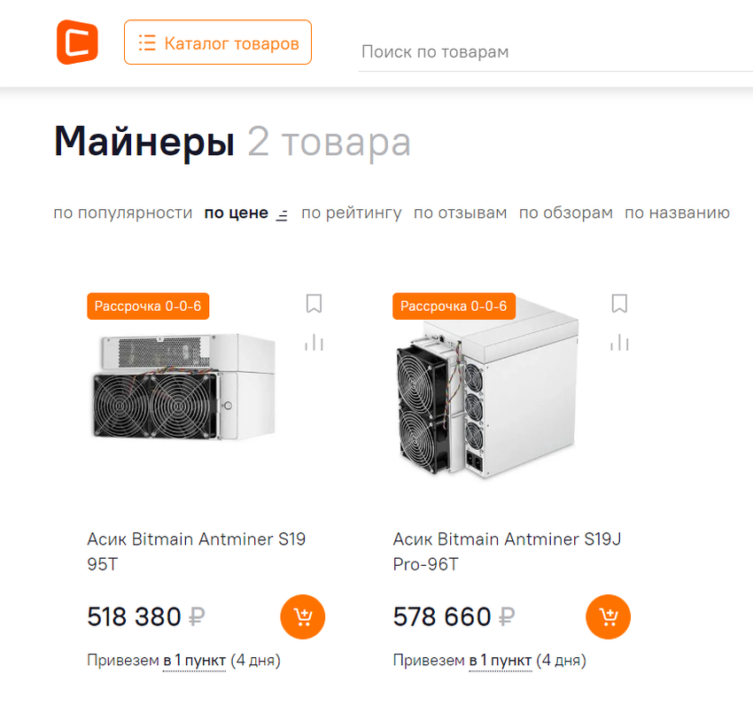 Сеть магазинов «Ситилинк» начала продавать ASIC’и для майнинга биткоина. Согласно каталогу официального сайта компании, в продаже есть два ASIC’a: Bitmain Antminer S19 (за ₽518 380) и Bitmain Antminer S19J Pro (за ₽578 660).