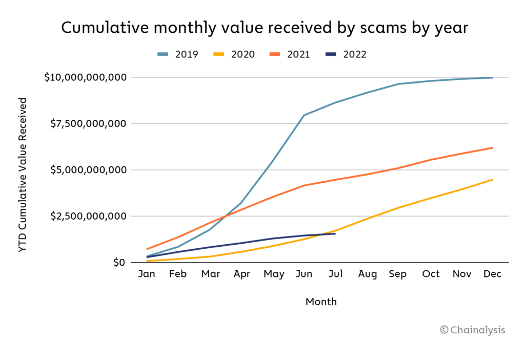 Наибольшее снижение активности зафиксировано в области мошенничеств. По сравнению с июлем 2021 года, выручка от мошенничеств сократилась на 65% до $1,6 млрд. Как считают в Chainalysis, падение выручки может быть связано с общим снижением показателей рынка криптовалют.
