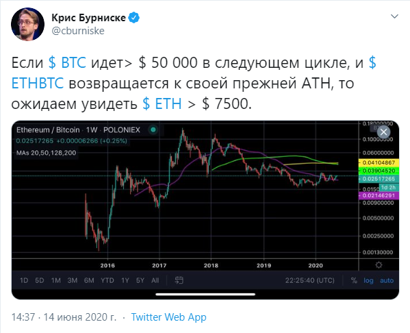 Дискуссию по этому поводу в Twitter открыл соавтор Cryptoassets Крис Бурниске. Он уверяет, что если главная криптовалюта в ближайшем времени пробьет порог в $50 000, то ЕТН тут же достигнет отметки в $7500. Однако, чтобы это произошло, рынок биткоинов должен снизить волатильность минимум в 2 раза. Если это произойдет, то уже в 2021 году биткоин может совершить реальный прорыв. Это заявление вызвало бурную реакцию среди пользователей, которые, как обычно, разделились на два лагеря.