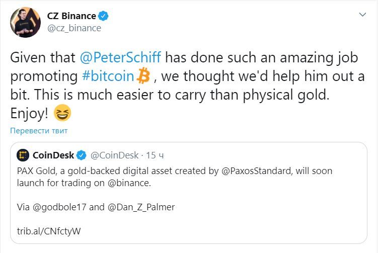 Sponsored«Питер Шифф проделал большую работу над популяризацией биткоина [отсылка к популярному в криптосообществе мнению, согласно которому критика биткоина со стороны Питера Шиффа часто приводит к росту стоимости криптовалюты]. Давайте теперь мы поможем ему. Актив [PAX Gold] гораздо проще хранить, чем физическое золото», – написал CEO Binance в своем микроблоге.