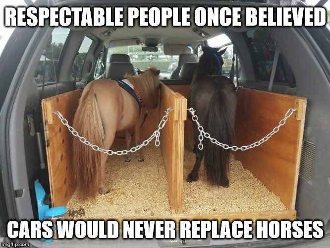 «Когда-то уважаемые люди верили в то, что машины никогда не заменят лошадей», – подпись к картинке.