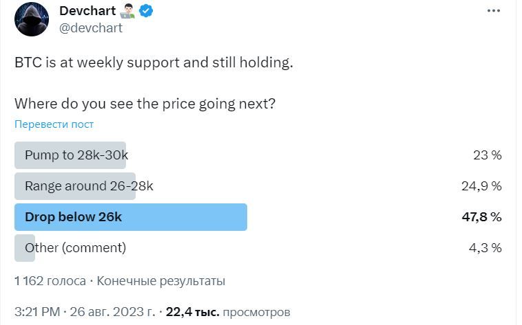 Опрос трейдера Devchart показал, что большинство участников рынка ждут падения биткоина ниже $26 тыс.