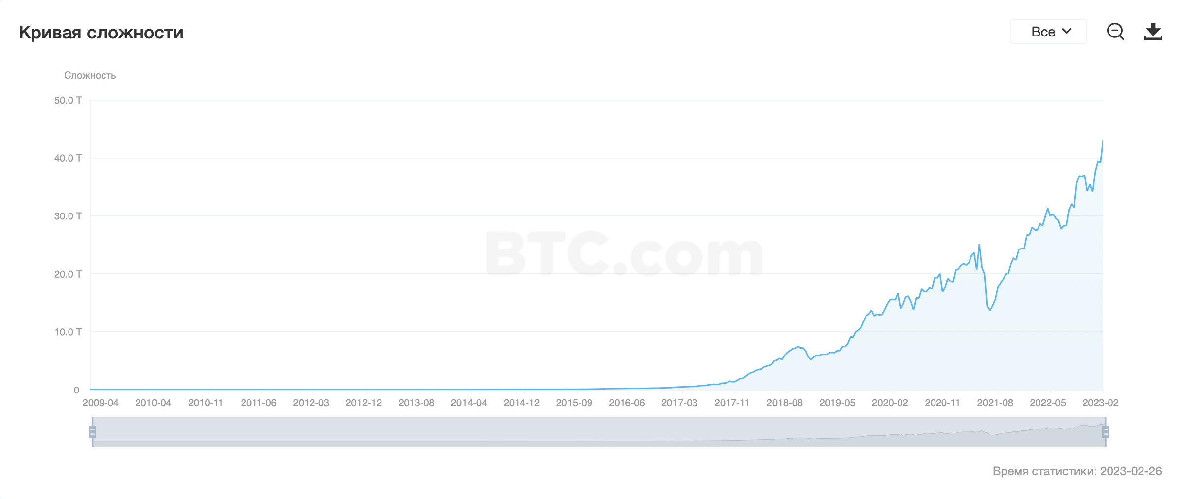 По данным BTC.com, 25 февраля сложность добычи биткоина выросла до 43,05 трлн. Это уже третий рекорд с начала 2023 года.