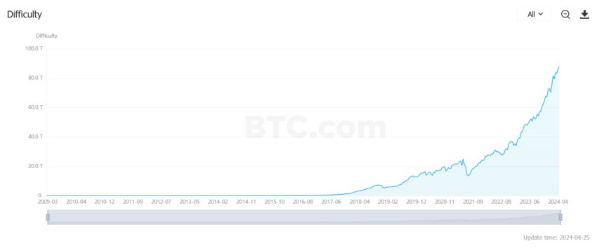 По данным BTC.com, в настоящее время сложность майнинга первой криптовалюты составляет 88.10 T.