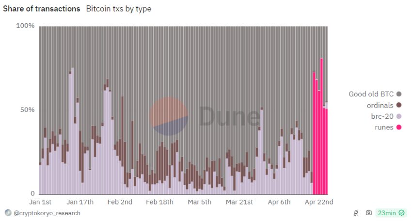 К настоящему моменту все показатели стабилизировались. По данным Mempool, средняя комиссия в сети BTC сейчас составляет около $7. Тем временем на долю Rune приходится 50% от всех транзакций в блокчейне, согласно Dune.