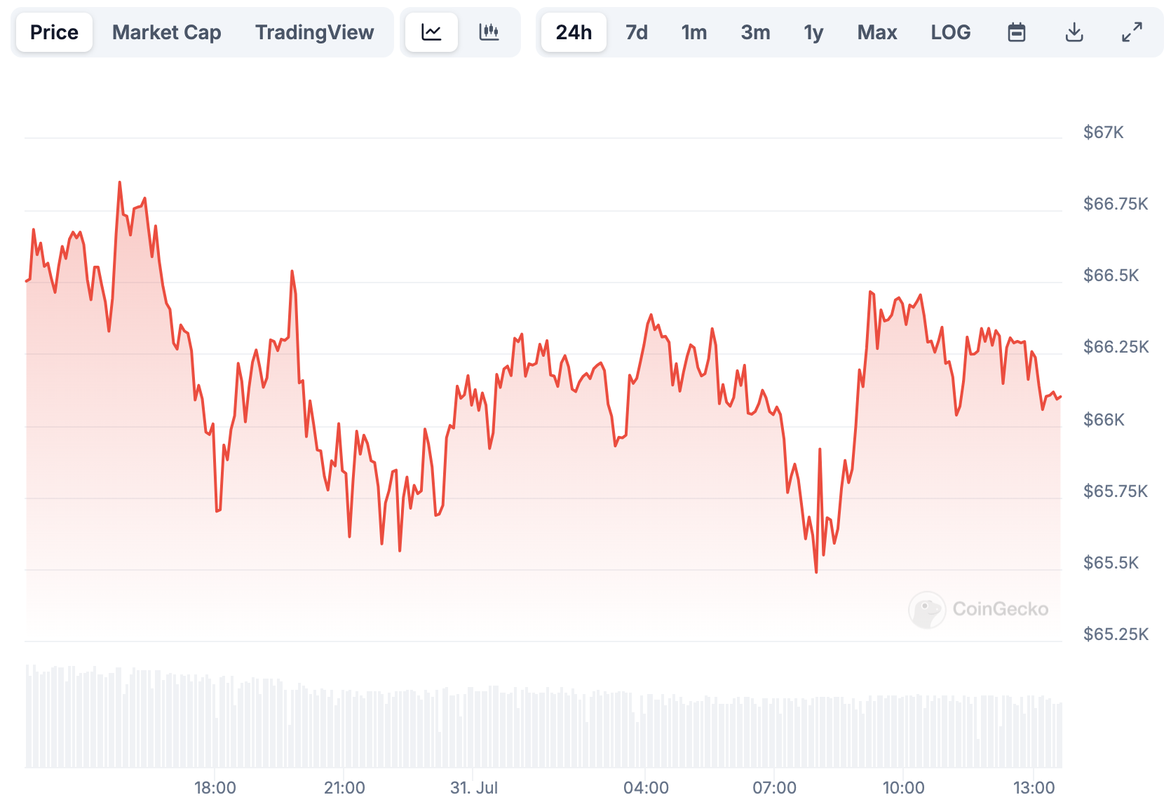 По данным CoinGecko, на момент написания материала первая по капитализации криптовалюта торгуется на отметке в $66 107. За последние сутки котировки BTC снизились на 0,6%.