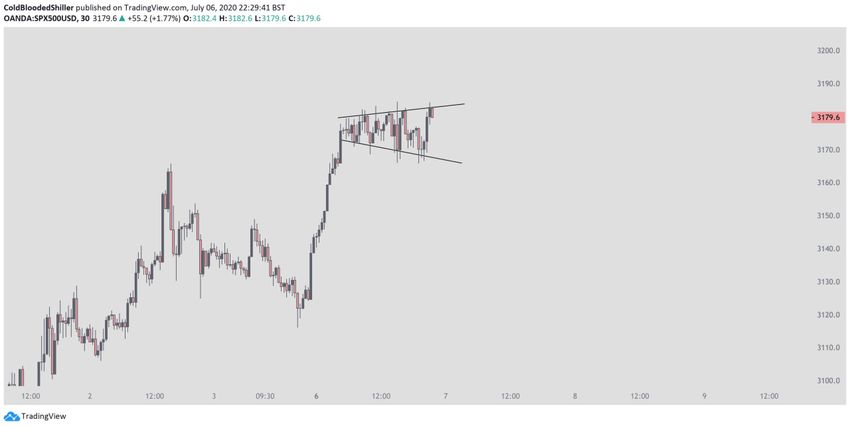 Криптовалютный трейдер @ColdbloodShill недавно поделился с читателями графиком SPX, демонстрирующим, что цена торгуется внутри расширяющегося треугольника. Такие треугольники поддерживаются очень недолго, и, согласно результатам нашего анализа, рынок должен прорвать его верхнюю границу.